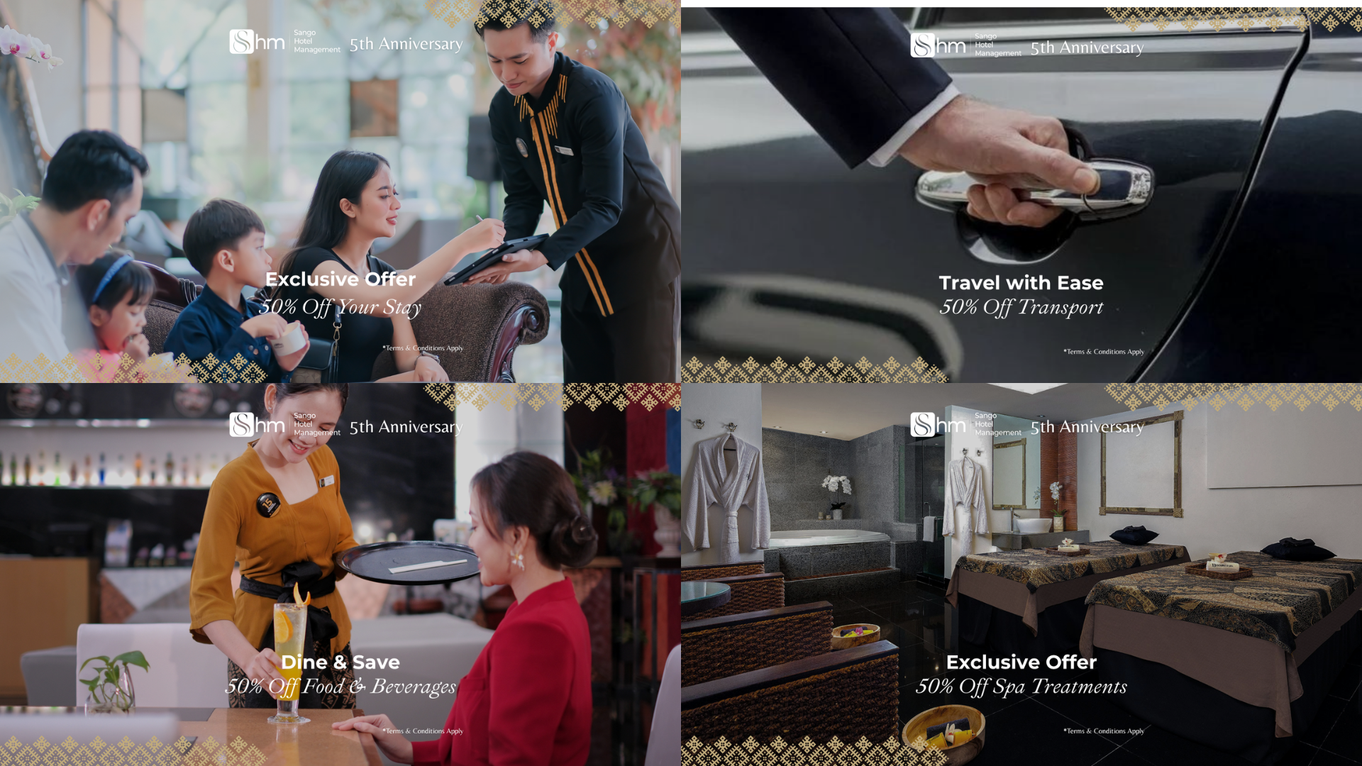 Tidak hanya menghadirkan program sosial, anniversary ke-5 SHM juga diramaikan dengan special anniversary promotion yang berlaku khusus pada 5 April 2026 di seluruh unit hotel. Promo spesial ini menghadirkan diskon 50% untuk berbagai layanan meliputi kamar, food & beverage (tidak termasuk alkohol), spa, transport, dan laundry. Pemesanan kamar dapat dilakukan melalui website resmi masing-masing hotel maupun direct booking melalui Front Office.