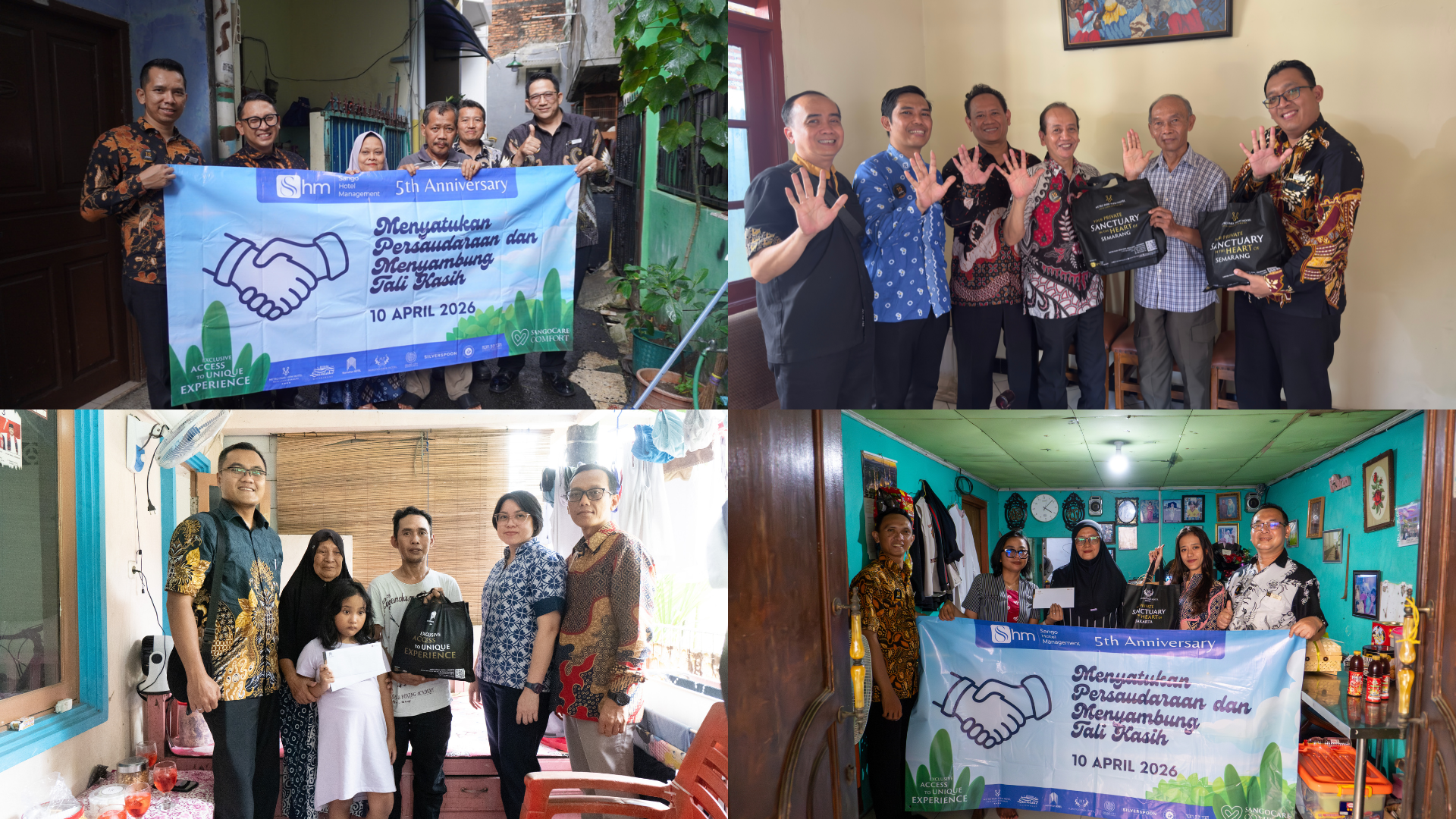 Sebagai bagian dari perayaan Special 5th Anniversary Sango Hotel Management, SHM menyelenggarakan rangkaian kegiatan dan campaign secara serentak di seluruh unit hotel sepanjang April 2026. Salah satu highlight utama dalam perayaan anniversary tahun ini adalah program CSR bertajuk “Menyatukan Persaudaraan dan Menyambung Tali Kasih” yang dilaksanakan pada 10 April 2026. Mengusung konsep sederhana namun hangat dan penuh makna, kegiatan ini selaras dengan tema besar anniversary yaitu menyatukan persaudaraan dan menyambung tali kasih. Melalui program ini, setiap General Manager bersama tim Human Resources dan Head of Department dari masing-masing unit hotel memilih lima pensiunan karyawan yang paling membutuhkan untuk diberikan santunan dan dikunjungi secara langsung.